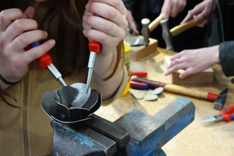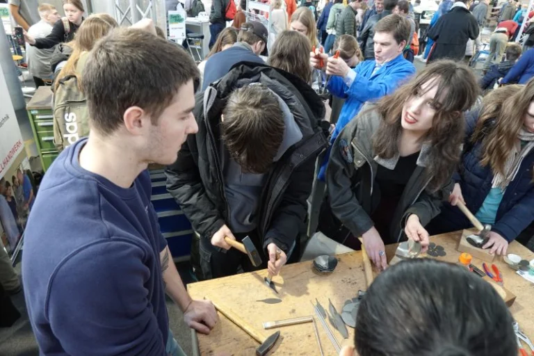Erstens konnten sich Interessierte unter Anleitung in der Fertigung filigraner Metallrosen üben. Metallrosen sind beliebte Geschenke, z. B. zum Valentinstag. Entsprechend groß war der Andrang. Übrigens stellte das Stand-Team erfreut fest, dass mindestens genauso viele junge Frauen wie Männer Spaß an dieser Form "romantischer" Handschmiedekunst hatten. Das Metallhandwerk eignet sich für alle!