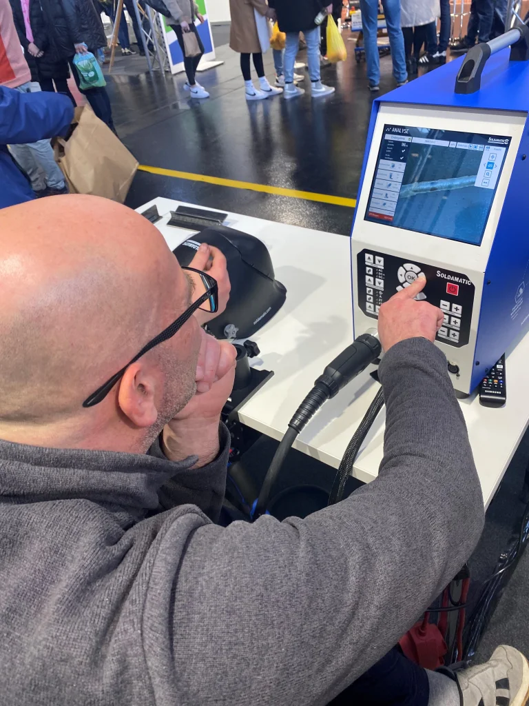 Die zweite Attraktion war ein Schweißsimulator. Mit Hilfe des topmodernen Geräts können Unerfahrene die Funktionsweise von Schweißgeräten und das Erstellen einer Schweißnaht spielerisch und gefahrlos erlernen. Virtual Reality macht’s möglich: Mit der Brille auf den Augen sehen Teilnehmende echtes Blech und einen echten Lichtbogen. Führen sie den Brenner korrekt, kommen sie zum richtigen Ergebnis. Das Gerät analysiert und bewertet die Leistung.